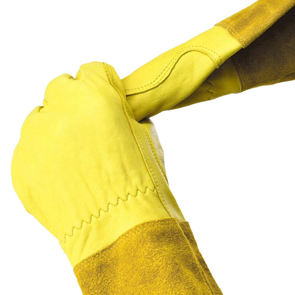 Feature: 1. Premium Material for Protection: Our rose pruning gloves are crafted from 100% natural, high-quality goatskin, offering unparalleled puncture resistance to keep your hands safe and scratch-free. This material provides the best breathability among all leather gloves, ensuring your hands stay cool and comfortable during long gardening sessions. 2. Elbow-Length for Full Coverage: Designed with protection in mind, our gardening gloves extend up to the elbow, providing comprehensive coverage. The extended cowhide cuffs safeguard your forearms against cuts and scratches, making these gloves ideal for handling roses and other thorny plants. 3. Durability Meets Comfort: Not only are our working mittens puncture-resistant, but they also boast excellent breathability and heat resistance, ensuring durability and comfort. Whether you're working under the hot sun or dealing with prickly plants, these gloves will keep your hands protected and comfortable. 4. Versatile Garden Gloves for Every Task: These labor protection long elbow gloves are not just for pruning roses. Their design and protective features make them suitable for a wide range of gardening tasks, from planting and weeding to handling compost and yard waste, providing a versatile solution for all your gardening needs. 5. Enhanced Safety Features for Peace of Mind: Our garden gloves are thoughtfully designed with the gardener's safety in mind. The combination of high-quality goatskin and extended cowhide cuffs offers a protective barrier against thorns, sharp objects, and heat, ensuring your gardening experience is not only productive but also safe. With these gloves, you can focus on beautifying your garden without worrying about potential injuries. Specification: Origin: Mainland China Product size: 410.00x100.00x50.00mm Product size: 16.14x3.94x1.97inch Material: Sheepskin Color: As shown Size: Hand circumference: M: 8.50-8.97 inches/21.5-22.7 cm L: 22.7-24cm XL: 9.44-10 inches/24cm-25.4cm Overall length M: 16.14 inches/41 cm L: 16.53 inches/42 cm XL: 16.92 inches/43 cm Palm length: M: 7.48 inches/19 cm L: 7.87 inches/20 cm XL: 21 cm Sleeve length: 22cm