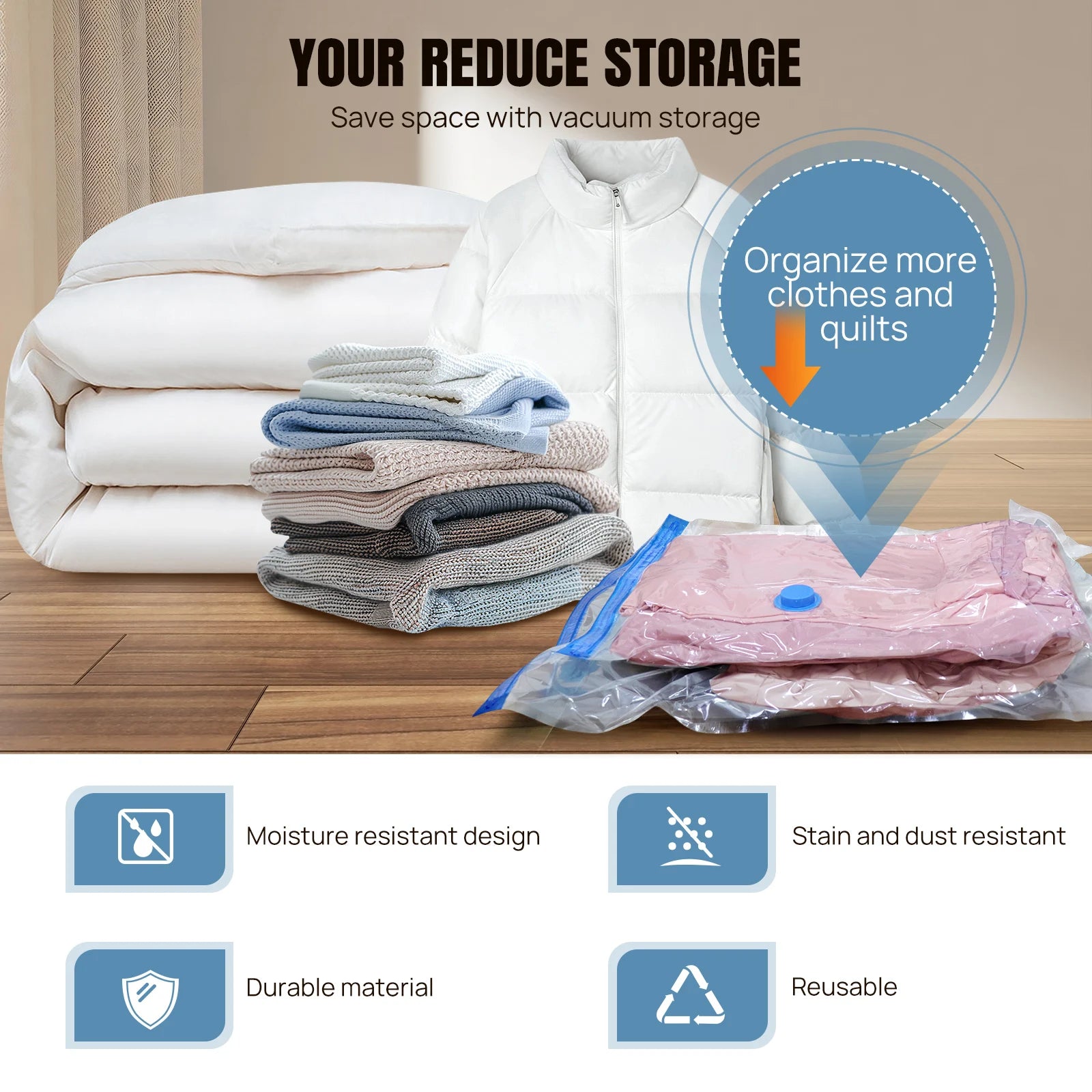 Maximize Space with Heavy-Duty Vacuum Storage Bags: Save up to 80% storage space with our 12-pack of heavy-duty vacuum storage bags, including large vacuum bags for duvets and clothes. Perfect for decluttering your home and organizing seasonal items efficiently.