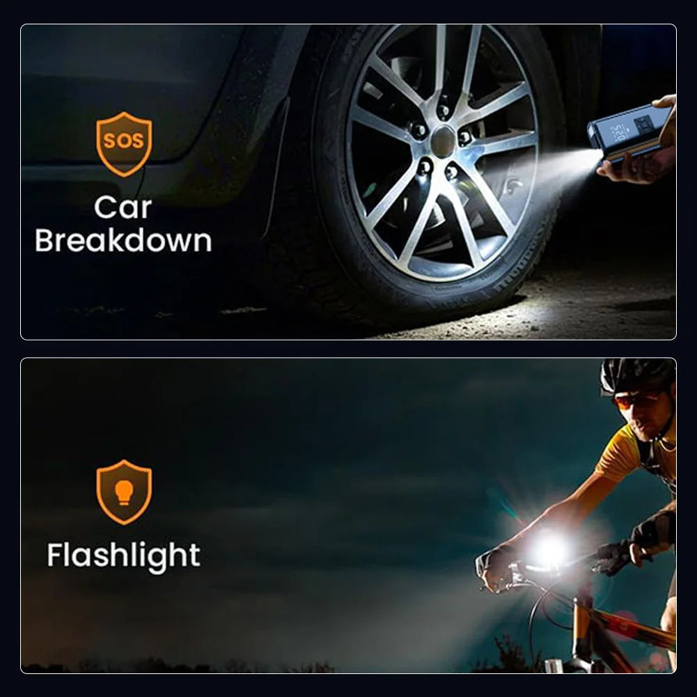Features: 1.Versatile Use: This car air pump comes with several auxiliary nozzles, making it for cars, motorcycles, bicycles, electric scooters, wheelchairs, basketballs, and footballs. Designed to be both functional and visually appealing. 2.Multi-Function Auto Inflation: With the electric tire pump, easily adjust the pressure to your desired level and it will automatically stop once the pressure is reached, preventing over-inflation. Maximum pressure is 150psi. 3.LCD Display: The portable car inflator pump features a digital LCD pressure gauge with four measurement units - PSI, KPA, BAR, KG/CM². The large screen displays real-time tire pressure accurately. 4.Lighting: Equipped with LED lights on top, this bicycle air compressor offers three modes - illumination, warning, and SOS for emergency situations, ideal for night use. 5.Design: Ergonomically designed, this car tire inflator is a portable mini pump, offering the best hand feel and convenience for users. Specification: Origin: Mainland China Material: ABS Size: 160x80x60.00mm/6.3x3.15x2.36inch Inflatable tube length: about 19cm This air pump needs to be connected to the car and started for power.