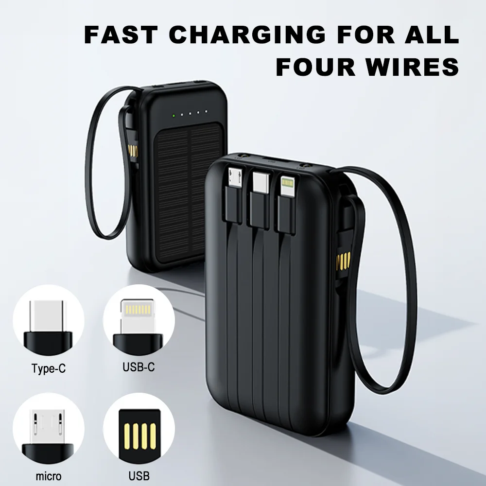 20000mAh Mini Solar Power Bank Built in 4 Cables Portable External Battery Pack with LED Light for Cell Phones