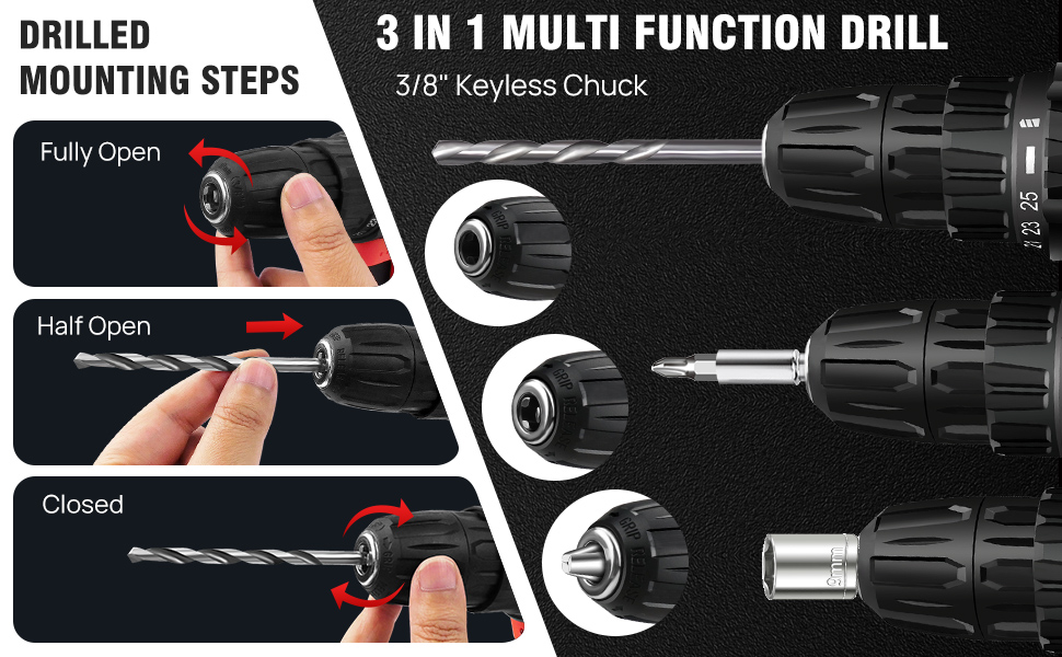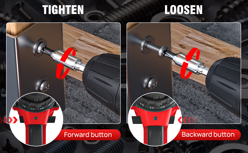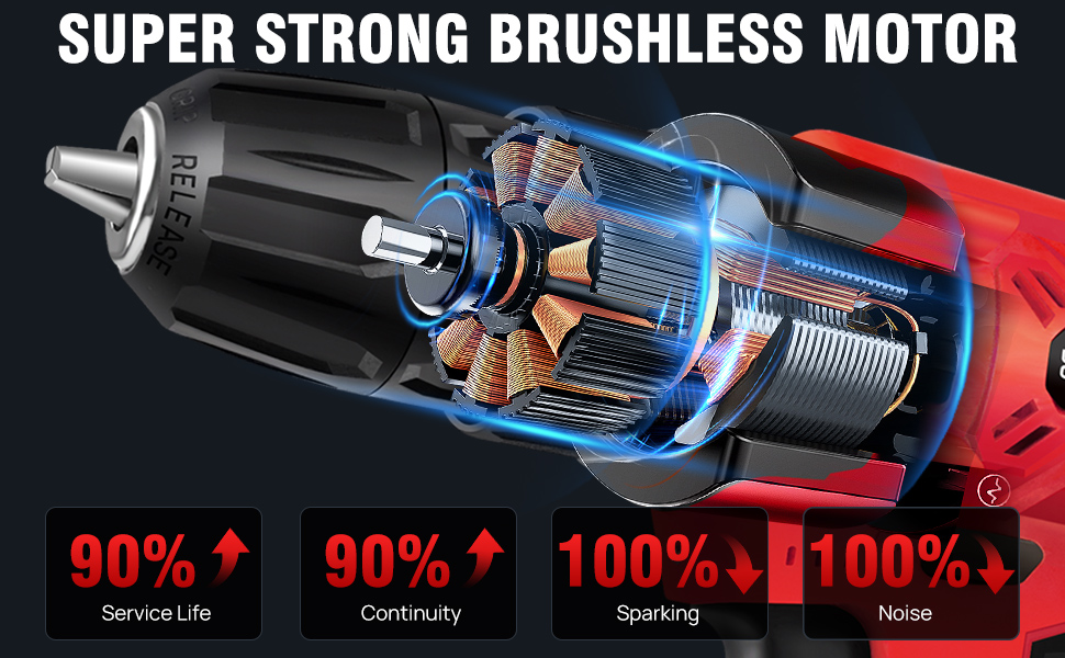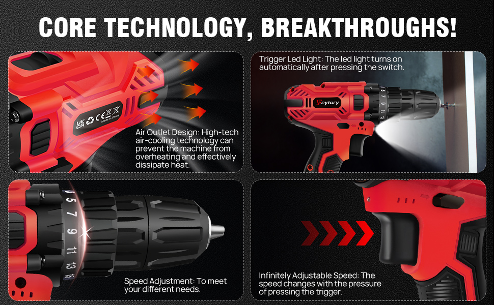 【Double layer protection for safer】The Cordless Drill Driver is equipped with a 3/8 "(10mm) keyless chuck that provides automatic locking. The self tightening chuck function can help you quickly and easily replace the drill bit, which means you can complete the work in a simpler and shorter time. The electric drill is also equipped with a safety lock to prevent accidental starting, providing you with safe protection and more reassuring use.