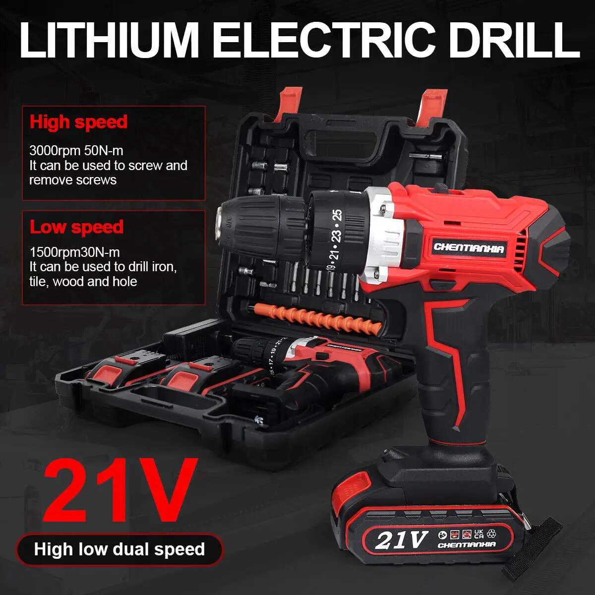 21V Cordless Hand Drill Combi Hammer Impact Drill Driver Electric Screwdriver 2 Battery Set