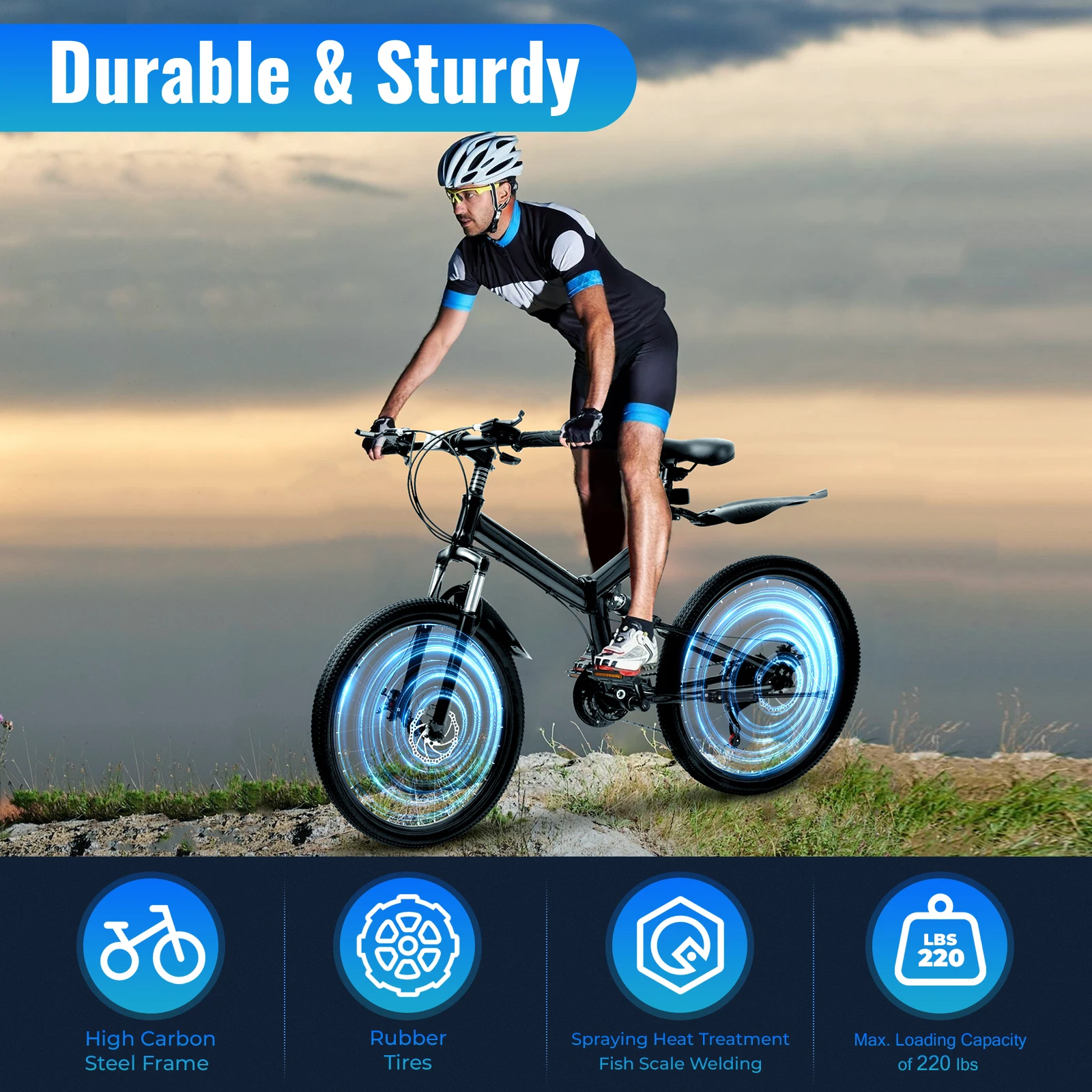 26 Inch Folding Mountain Bike 21 Speed Double Disc Brake Carbon Steel Frame Foldable Design 100kg Load Adult Bicycle