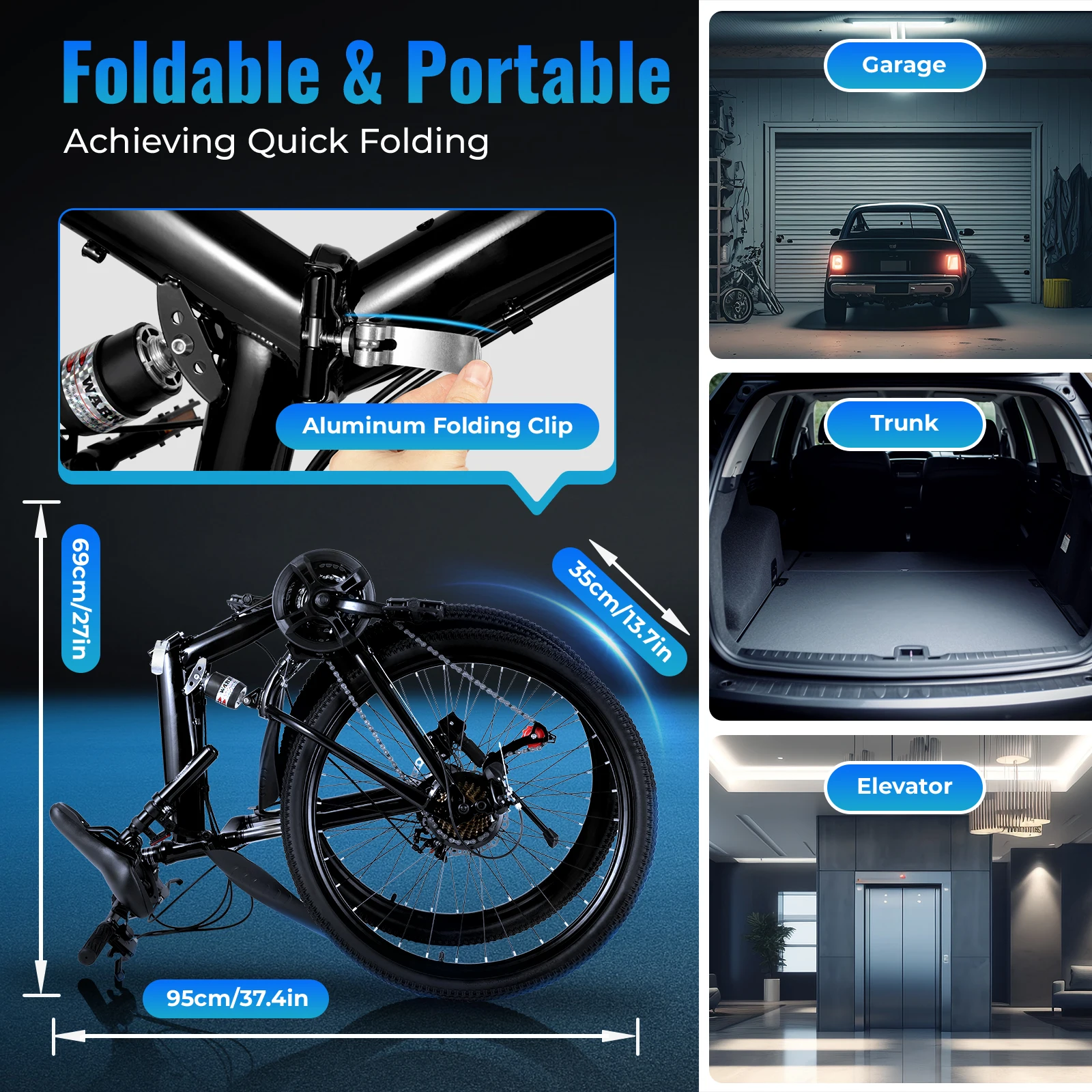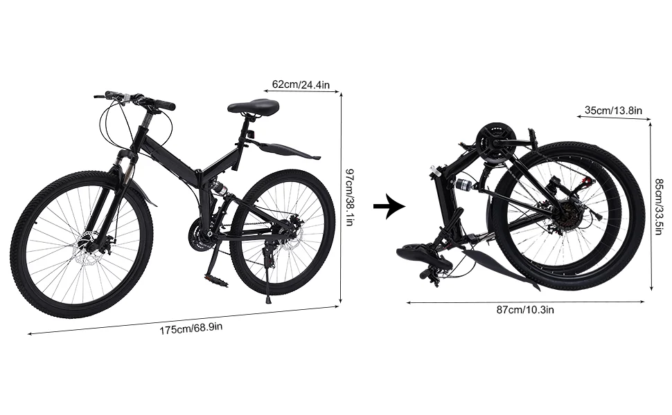 Foldable Design: The mountain bike has a foldable design in the frame, and the folded size is around 34.3*33.5*13.8inch. So it's easy to place it at home, in the office, in the trunk, etc.