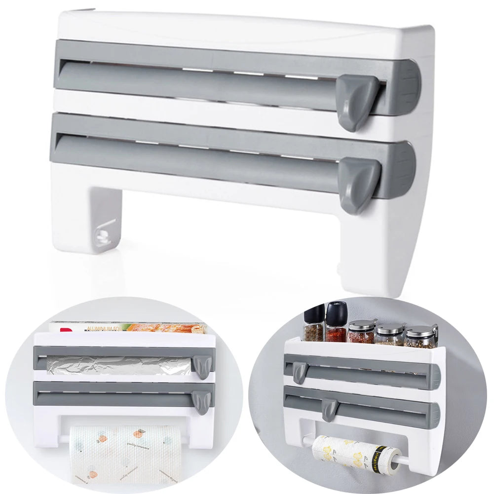 This wrap dispenser with cutter is made of high-quality ABS material, which is highly durable and non-toxic. Featuring a wall-mounted design, it can be directly pasted or nailed to the wall according to personal preference. With this one piece, you can keep everything neatly stored, including spice, kitchen paper and towel. Each roll container is equipped with sharp blades for neat and accurate cutting. This shelf is very