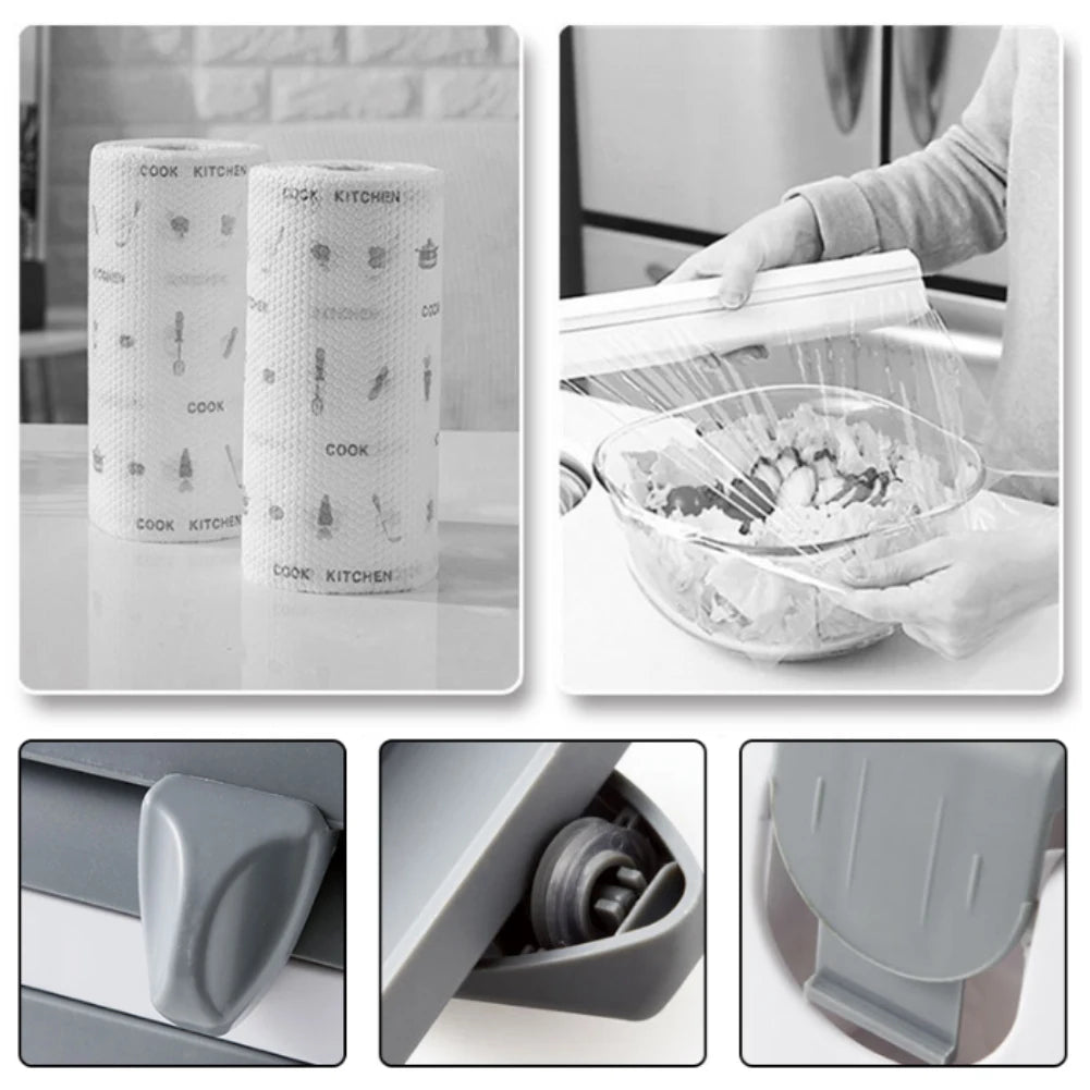 ABS Material Wall Mounted Kitchen Cling Film Dispenser with Cutter, Cling Film Aluminum Foil Roll Holder Paper Towel Holder Grey
