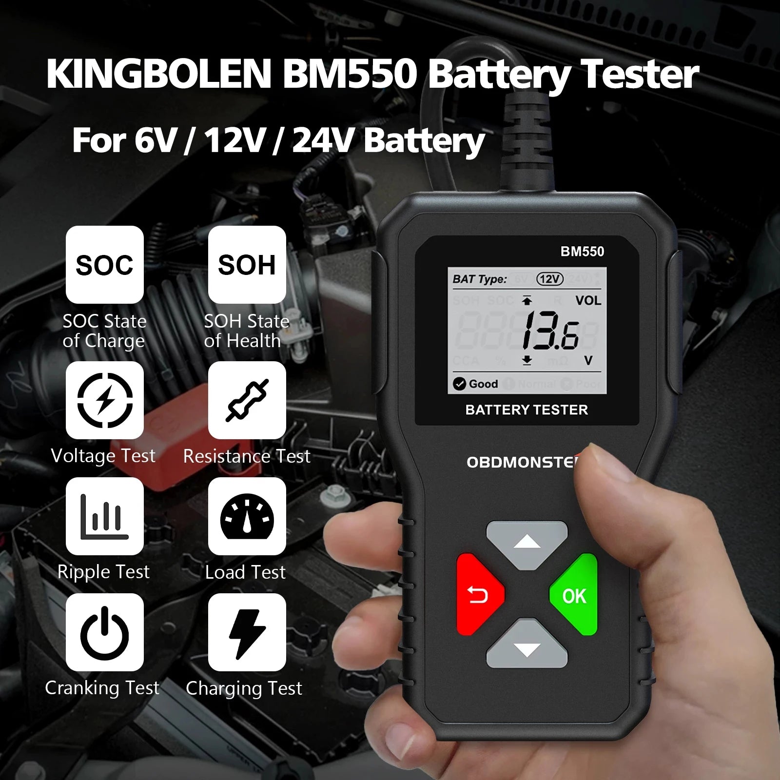 KINGBOLEN BM550 Car Battery Tester OBD2 6V 12V 24V 100-2000 CCA 2Ah-220Ah Battery System Detect Auto Battery Analyzer Car Diagnostic Tool