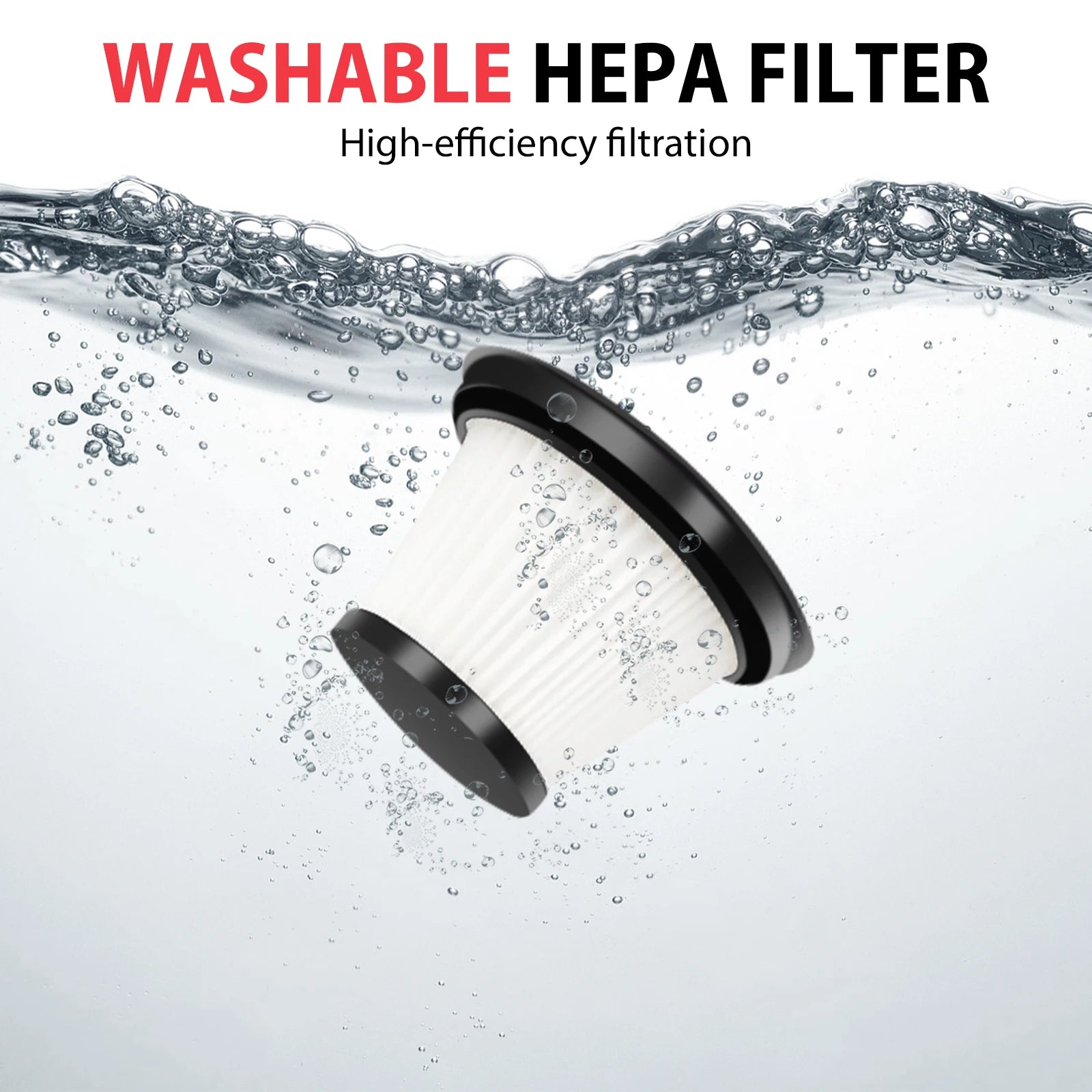3 WASHABLE FILTERS & LONG BATTERY LIFE: The handheld vacuum cleaner comes with 2200mAh Li-Ion battery and a quick charger that can work for up to 30 minutes on a full charge to help you with all-around cleaning, and 3 washable HEPA filters prevent clogging of the filters to ensure perfect suction and save you the cost of buying additional filters.