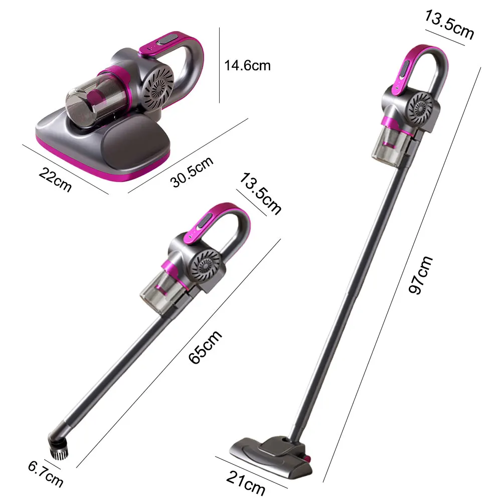 Features: 1.Advanced Digital Motor Technology: Discover the cordless vacuum cleaner designed with cutting-edge digital motor technology, ideal for home and car cleaning. Its lightweight and user-friendly design makes it an ideal thoughtful gift. 2.Max Mode Strong Suction Power: Experience the handheld vacuum with strong suction that effectively removes debris from all surfaces, including hardwood floors, carpets, tiles, and marble, making it great for everyday cleaning. 3.Washable Filter Unit: The stick vacuum features a removable and washable filter unit. After cleaning, ensure the components are dry before reinserting them into the device for optimal performance. 4.One-Touch Dust Disposal: With the strong suction vacuum cleaner, one-touch dust disposal makes cleaning hassle-free, ensuring your space remains tidy and dust-free effortlessly. 5.Powerful and Sturdy: Powered by an 11.1V battery with dual-chip protection, this self-standing vacuum cleaner provides up to 25-30 minutes of continuous cleaning after only 4 hours of charging. Specification: Origin: Mainland China Mite Remover: 305x220x146mm Handheld Brush: 650x135x67mm Vacuum Cleaner: 970x210x135mm