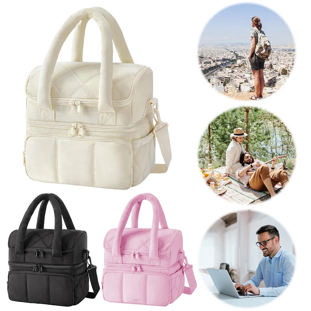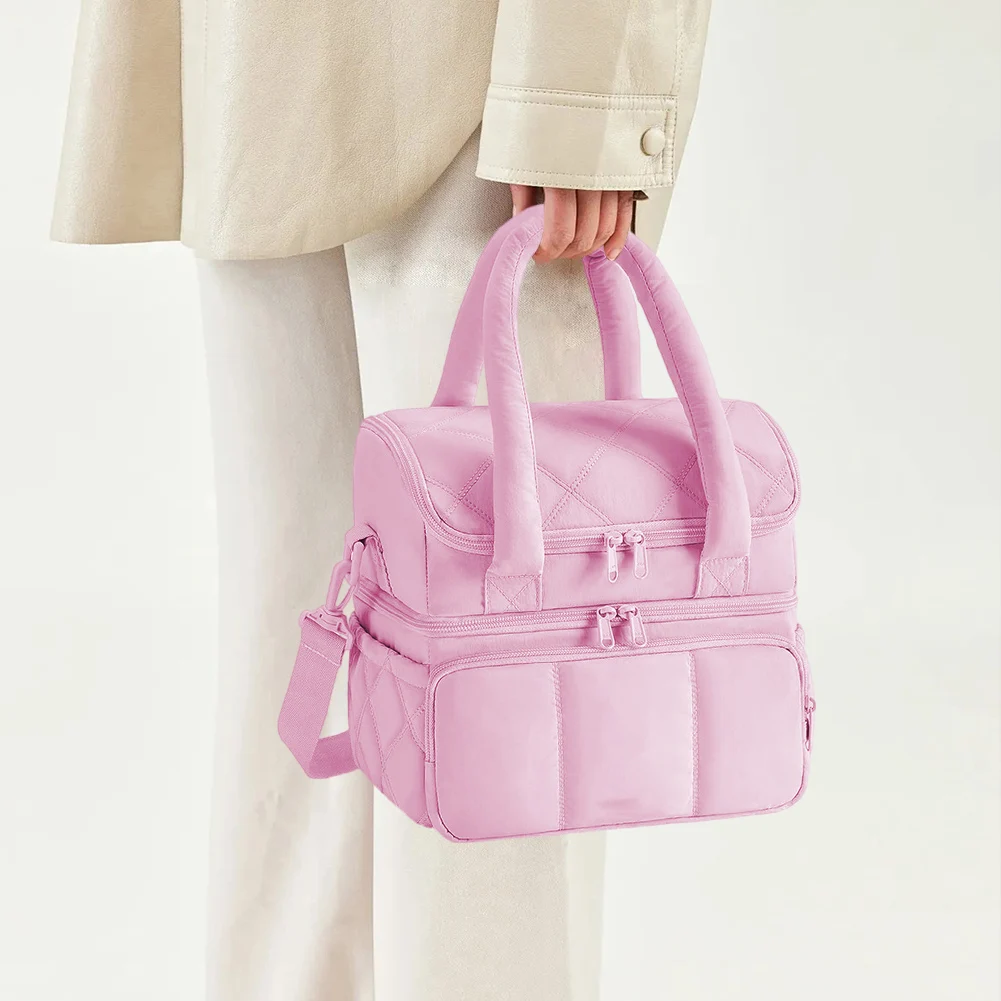 Insulated Double Deck Lunch Bag for Women Ladies Puffy Padded Lunch Tote Waterproof Bento Top Handle Bag for Work Picnic Travel