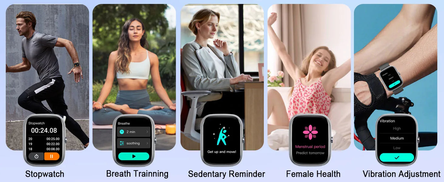 This pedometer watch also has a variety of useful functions, such as weather forecast, music control, sedentary reminder, stopwatch, alarm clock, timer, tracking women's cycle, screen brightness time, find mobile phone and so on.