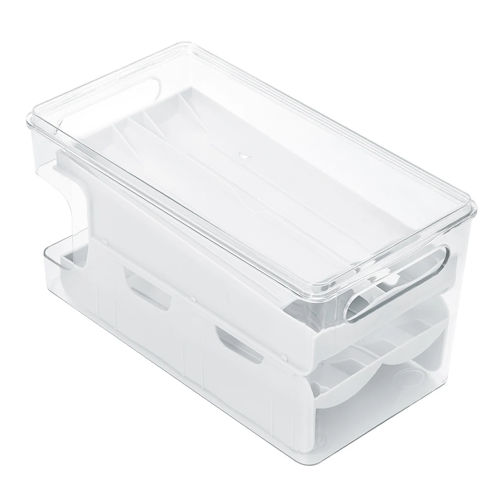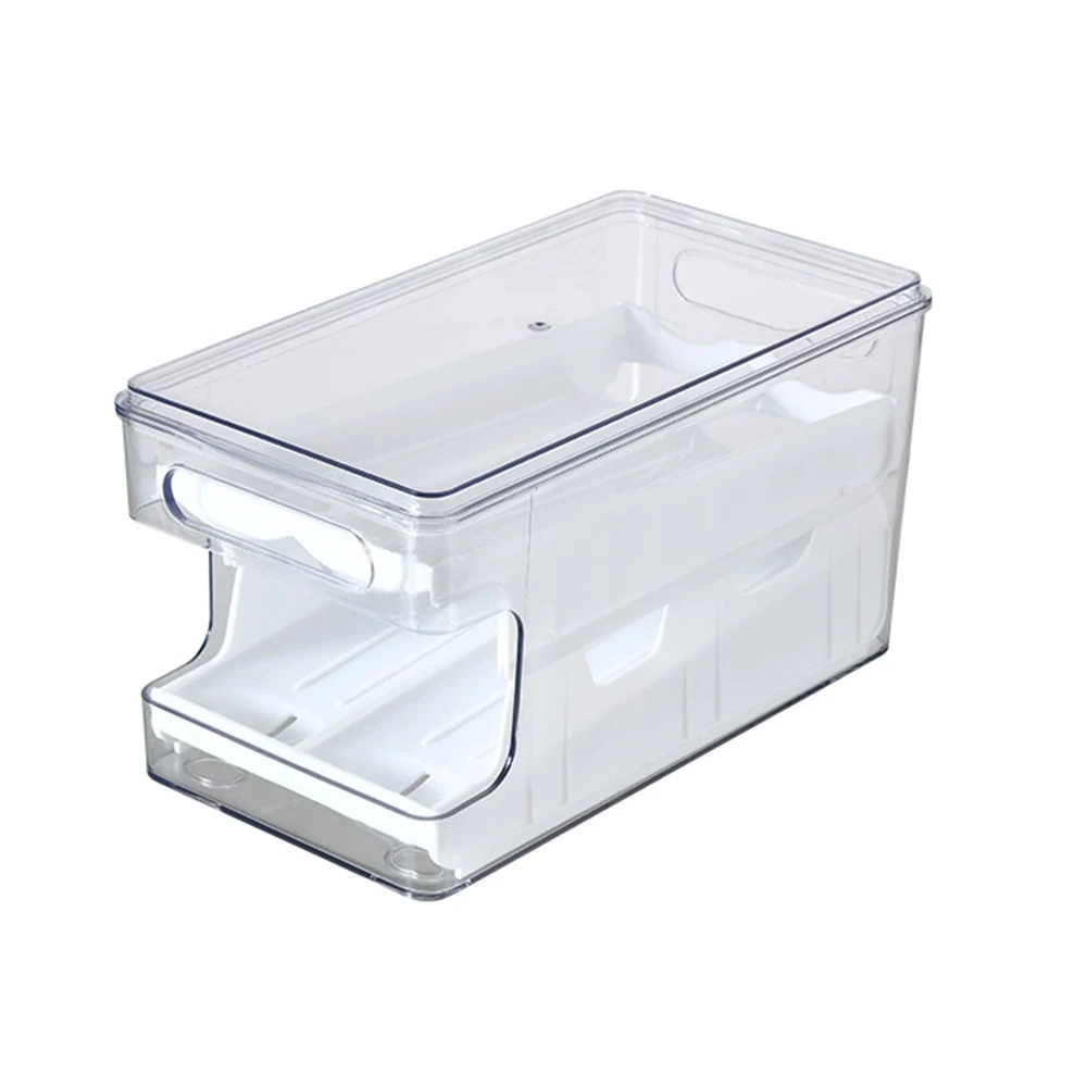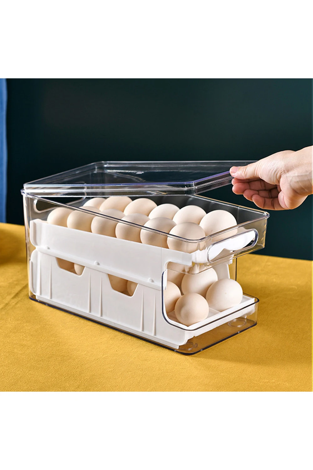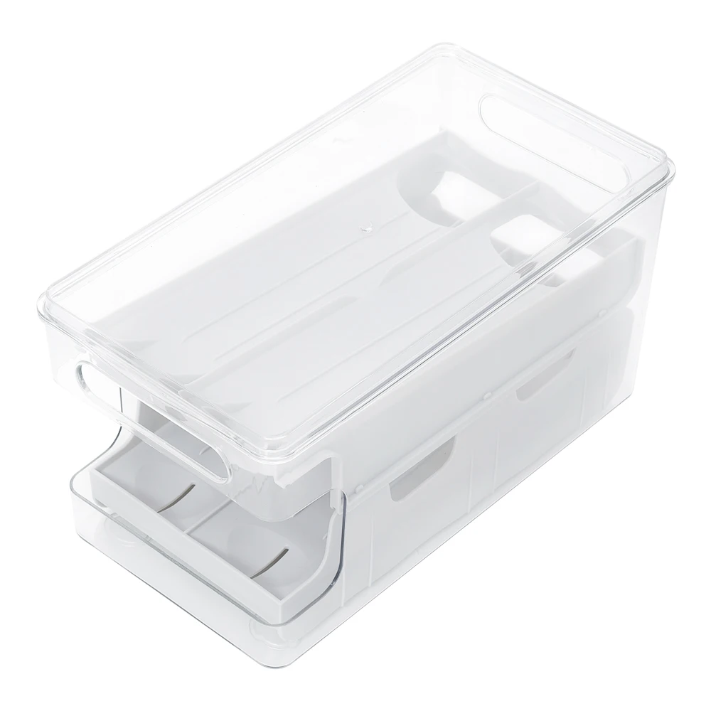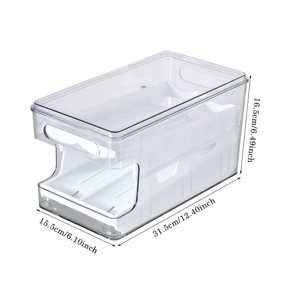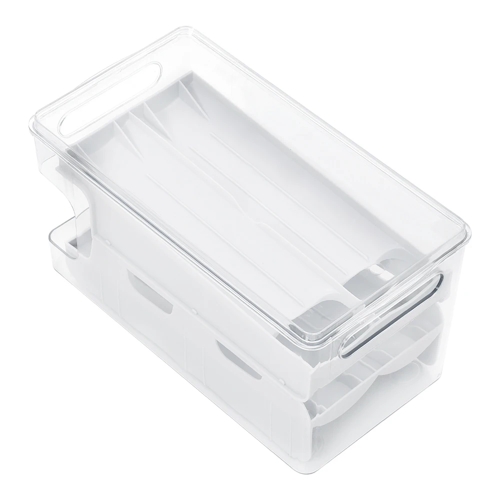 Bid farewell to all your egg storage woes with this 2-layer egg holder. Specifically designed to optimize refrigerator space, it neatly organizes eggs for easy access. Equipped with a rolling mechanism, even the eggs at the very back can be effortlessly retrieved. The transparent design allows you to instantly see the quantity and condition of the eggs, making it convenient to replenish your supply anytime. Furthermore, the spacious opening design not only facilitates easy retrieval but also ensures proper ventilation inside, keeping the eggs fresh. With its thoughtful design and practical features, this double-layer egg holder is sure to become a staple in your kitchen, bringing convenience to your fridge egg storage.