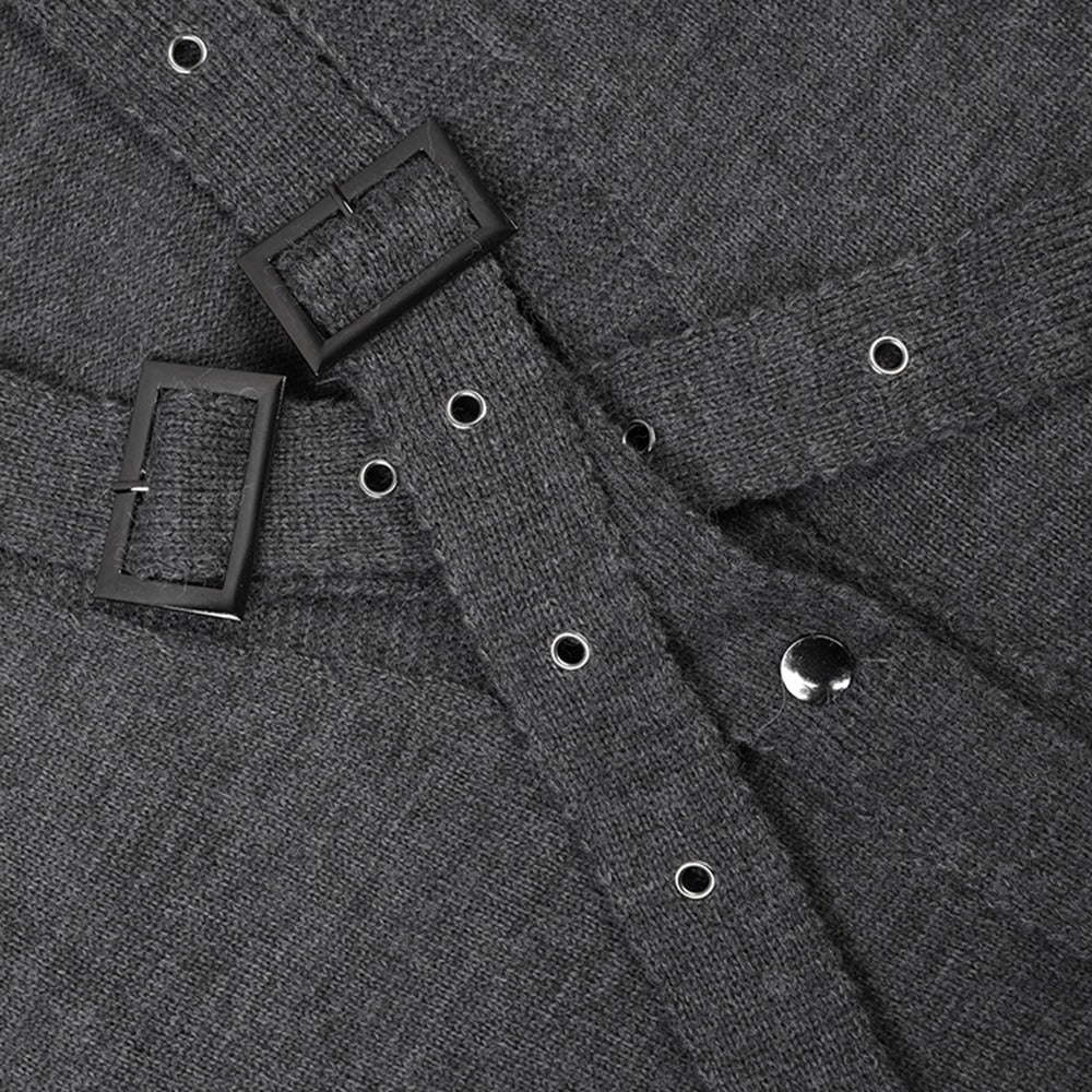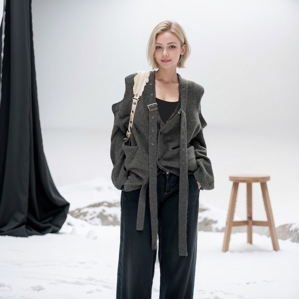 Off shoulder loop with V-neck knitted cardigan women's trendy silhouette single breasted long sleeved gray knitted top