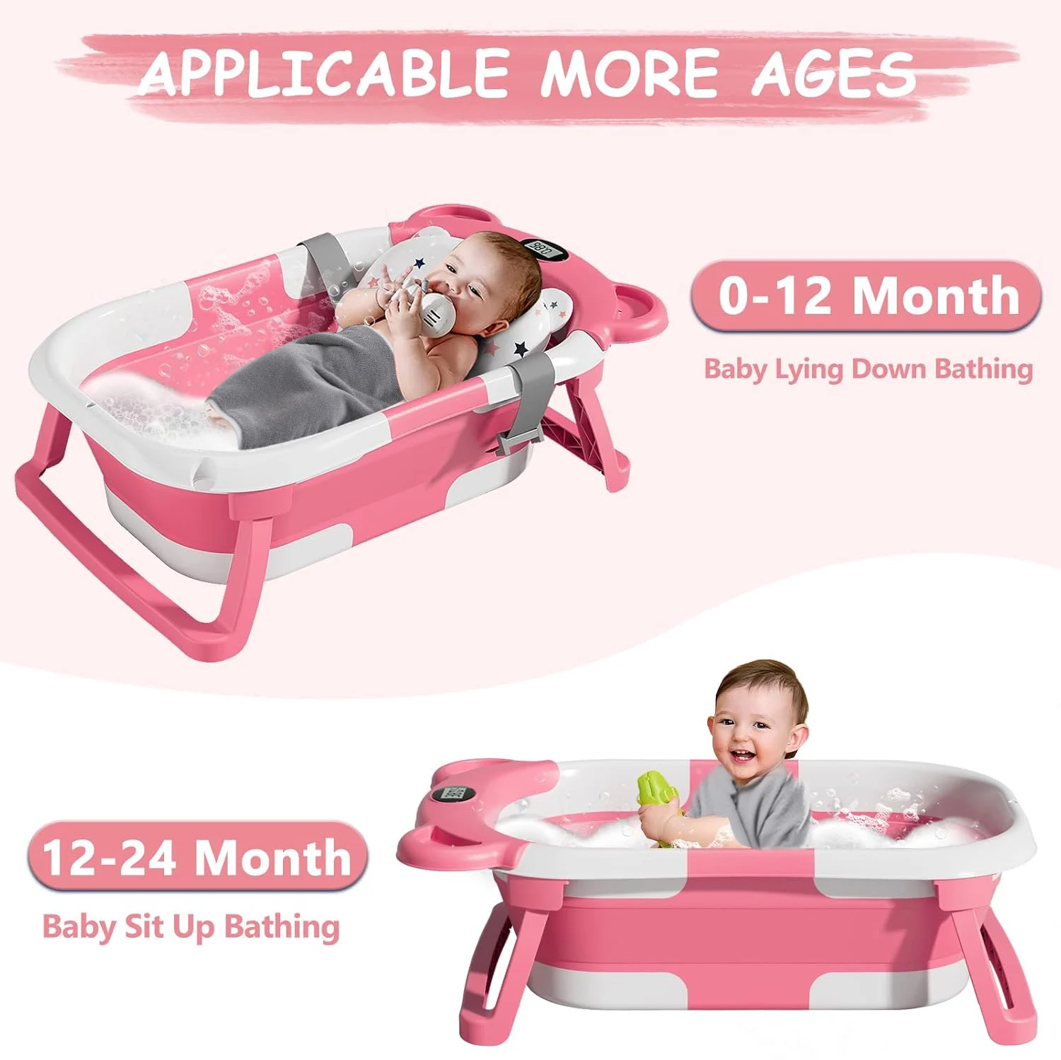 Portable Travel Bathtub, Collapsible Baby Bathtub, with Thermometer &1Soft Floating Cushion, with Drain Hole,For Baby 0-36 Month