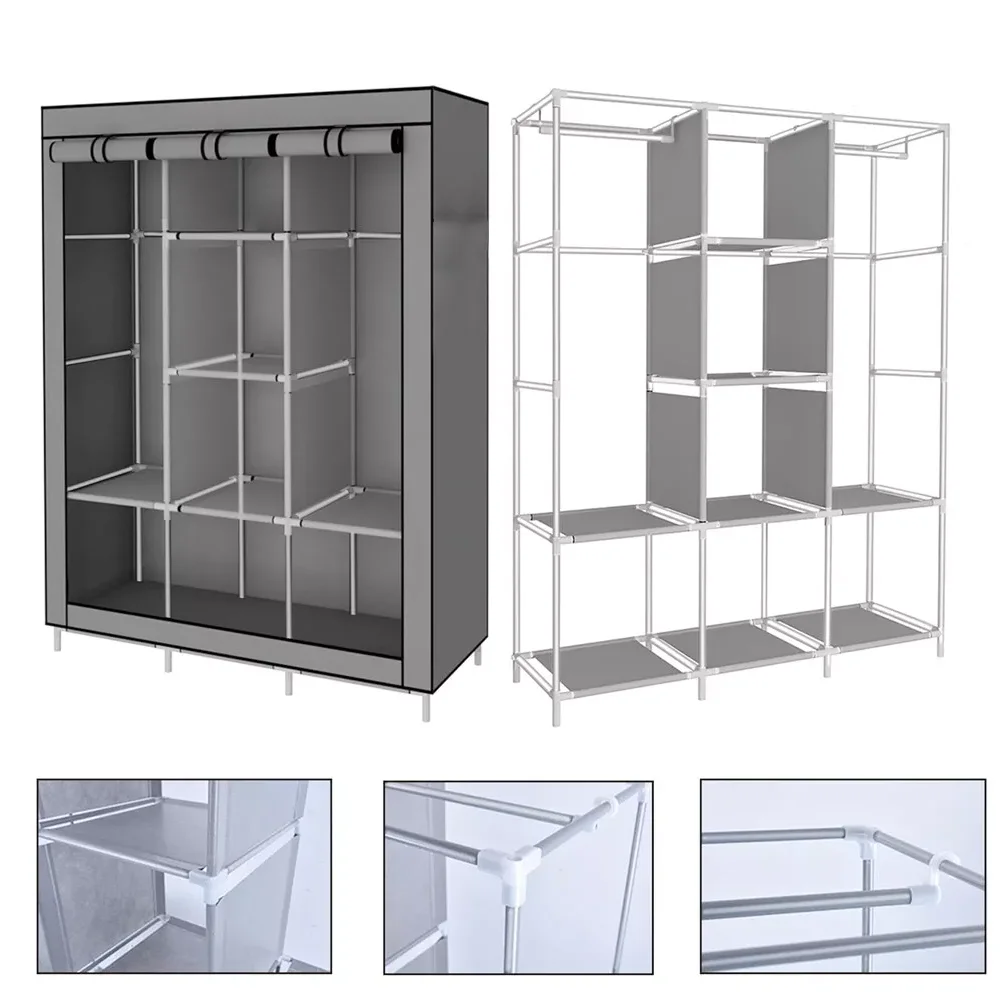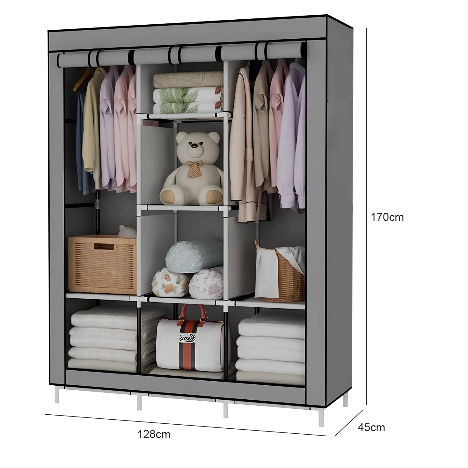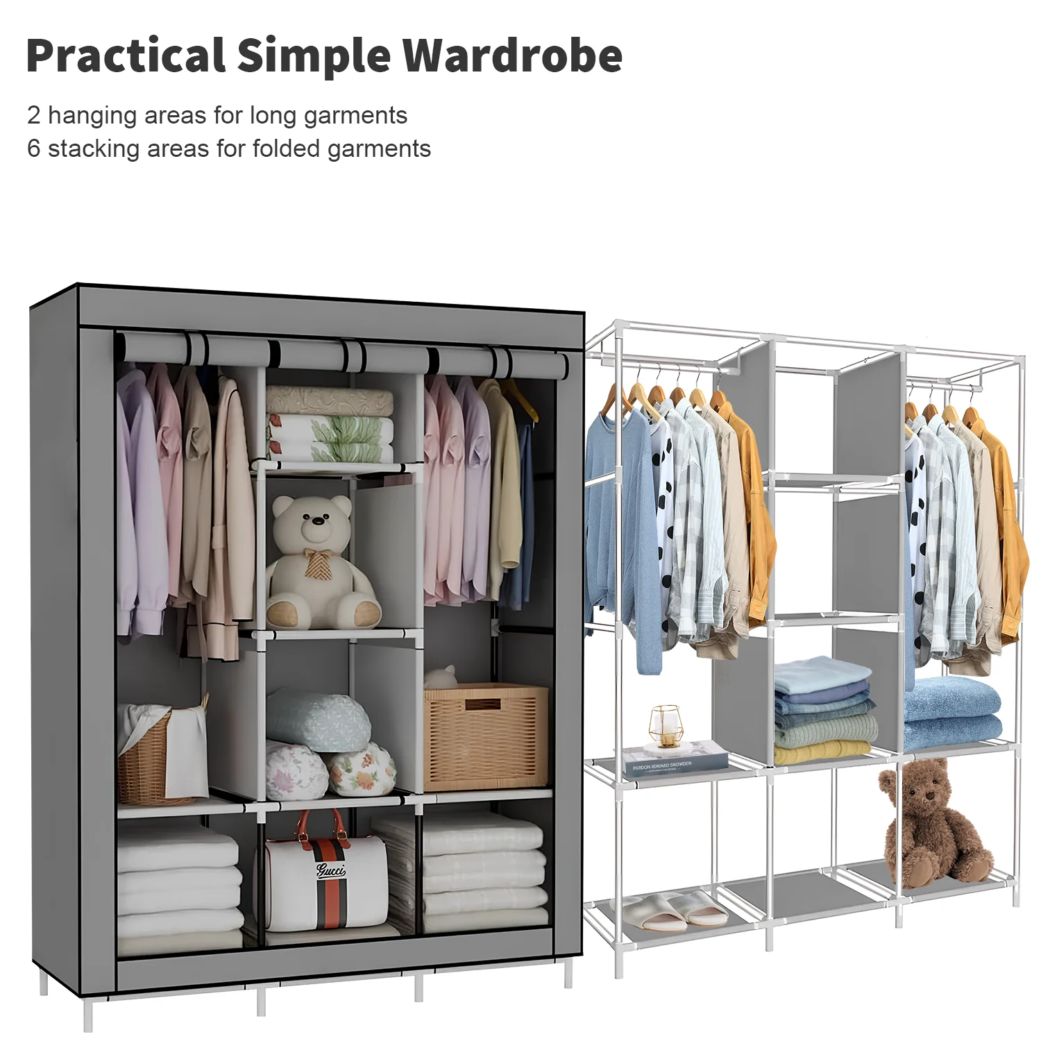 2 compartments for hanging clothes and 6 compartments for folding clothes storage.