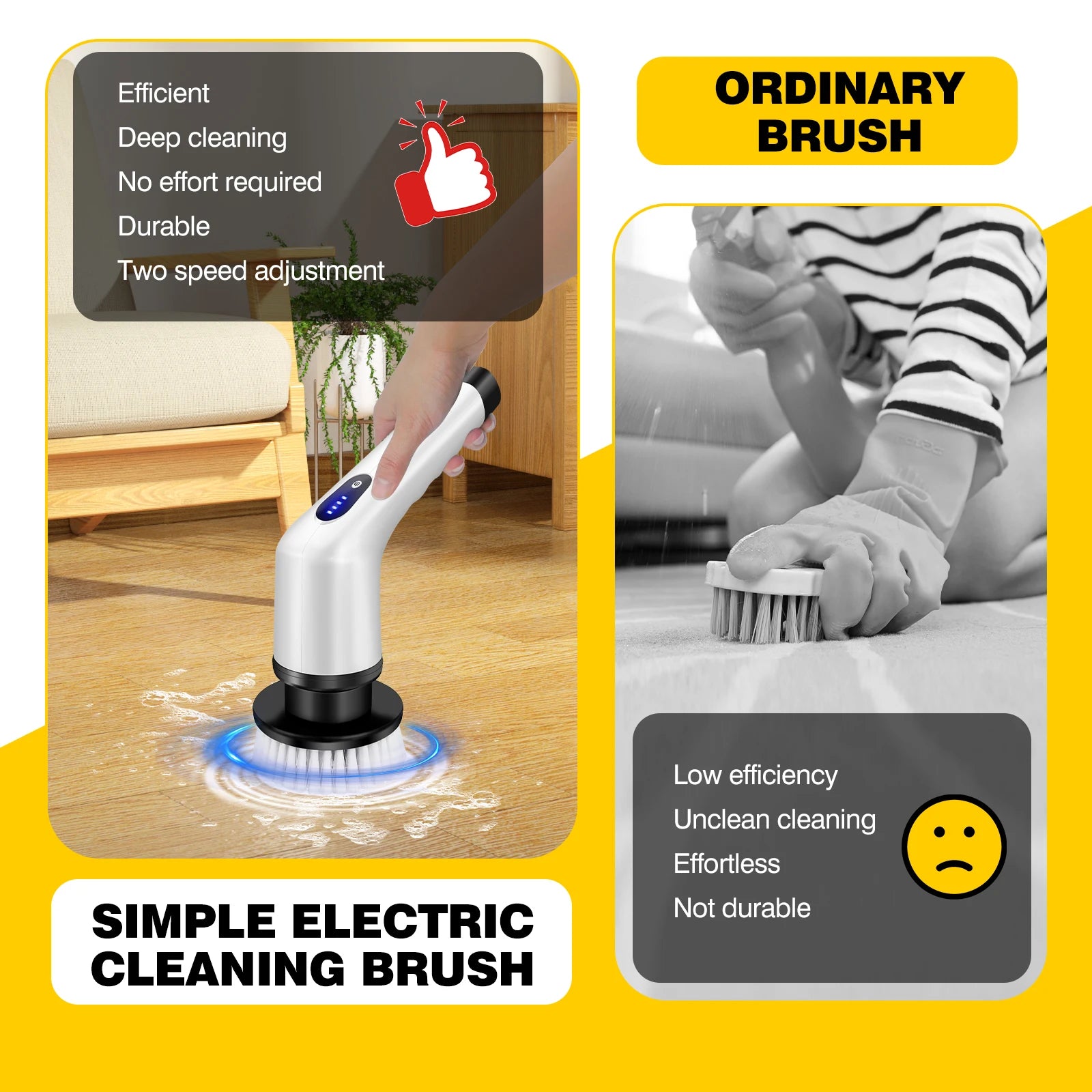 đ˘ ă2 Speed Efficiency Cleaningă Featuring an upgraded motor, our effective electric cleaning brush reduces cleaning time by up to 80%, 2 adjustable spin speeds, click once, For Normal Clean,  click twice, For Deep Clean, one-click switch. Stubborn stains, soap stains, dirt and more will be removed in minutes. You'll have more time to do the things that make you enjoy life instead of cleaning!